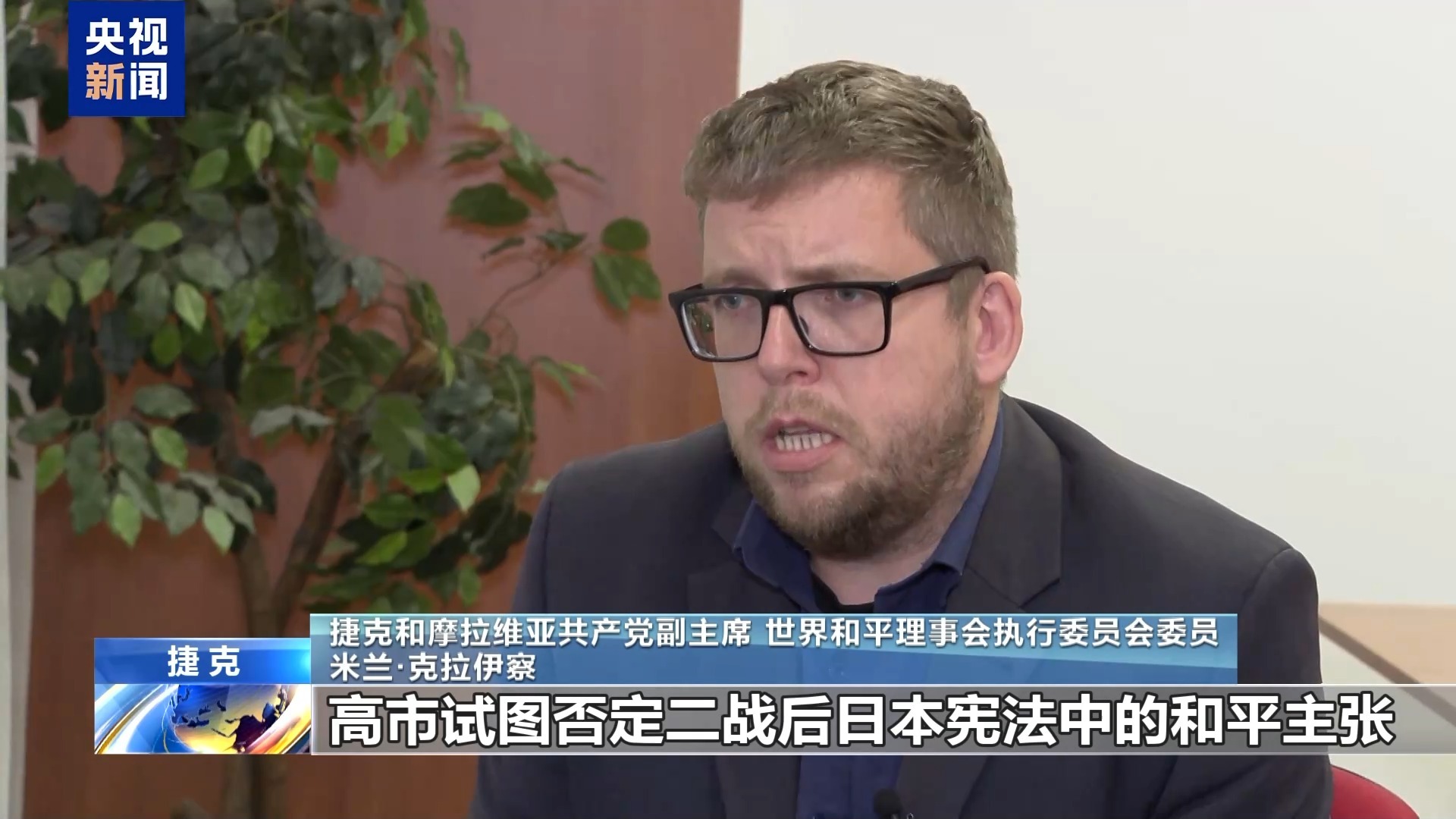 捷克和摩拉维亚共产党副主席 世界和平理事会执行委员会委员 米兰·克拉伊察:高市试图否定二战后日本宪法中的和平主张,她还曾参拜靖国神社,公开支持那些在二战期间对中国人民犯下严重罪行的人。如果将这些淡化日本二战罪行的行为,与日本当今错误政策,比如近期关于中国台湾的错误言论联系起来,就能非常清楚地看到,历史罪行重演的可能性。