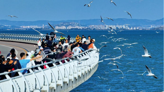 人们在昆明市海埂大坝喂食红嘴鸥。新华社记者 胡超 摄