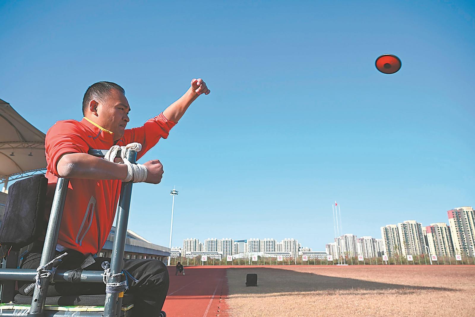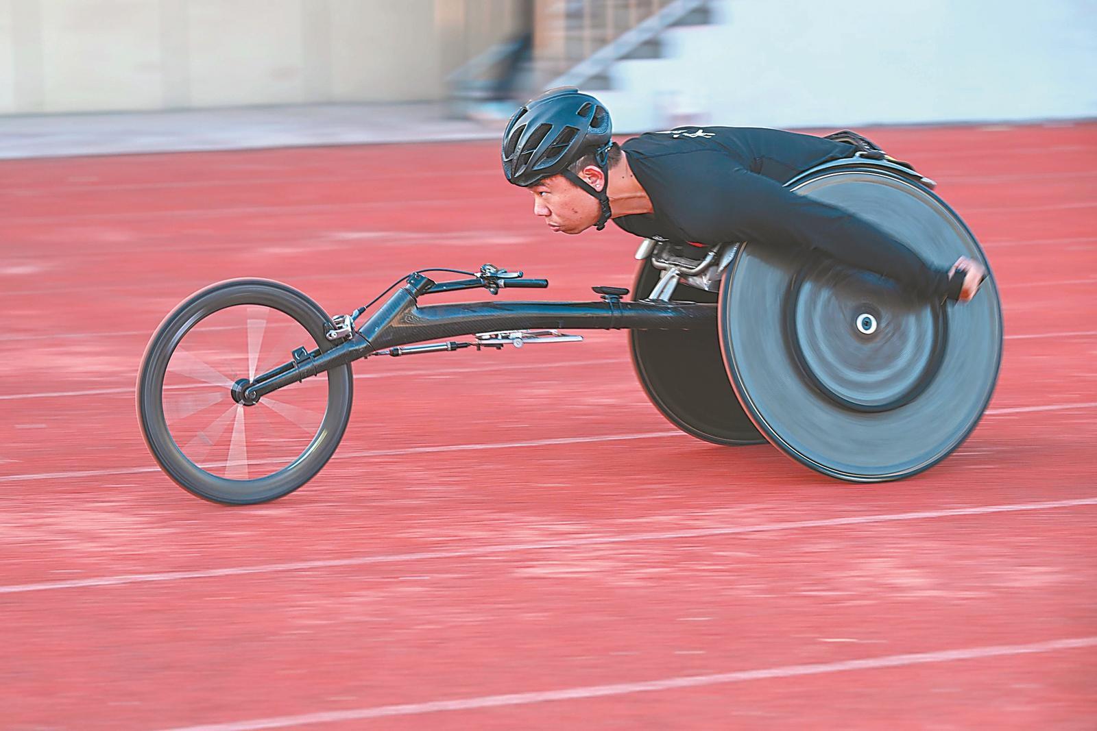 11月25日,安徽省代表团运动员杨少桥正在练习轮椅竞速。