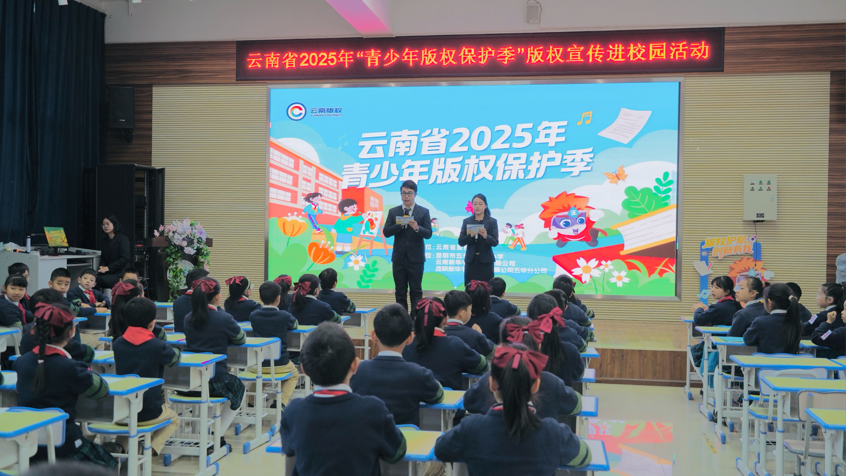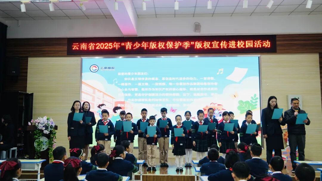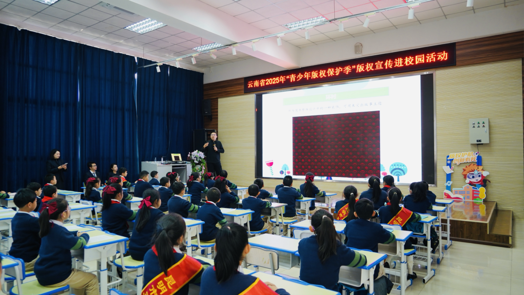 11月28日,云南省2025年“青少年版权保护季”版权宣传活动走进昆明市五华区文林小学。本次活动以“版权护航 创新有我”为主题,精心设置版权倡议宣读、作品版权登记证书发放、版权知识校园讲座等环节,旨在大力传播版权保护知识,加强版权宣传教育,引导青少年树立“创新创造、尊重版权”的正确观念,自觉抵制盗版和不健康内容。