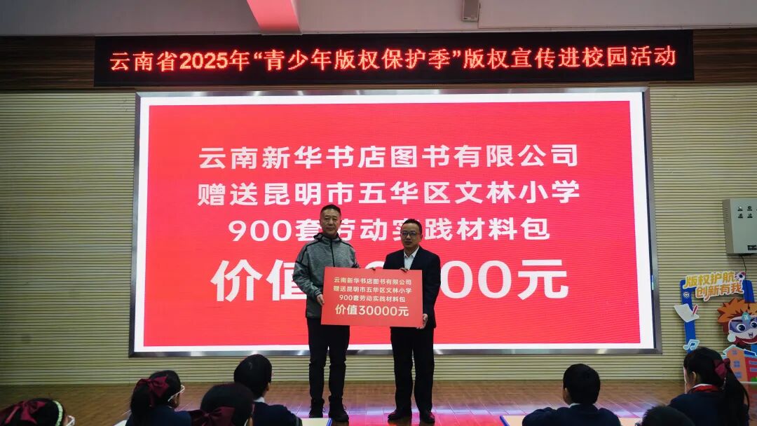 活动现场向昆明市第五届青少年科技绘画活动获奖作品学生代表颁发版权作品登记证书,激励更多青少年积极参与到版权保护行动中来。云南新华书店图书有限公司向文林小学捐赠900套劳动实践材料包,助力学生创新创造能力和实践能力培养。