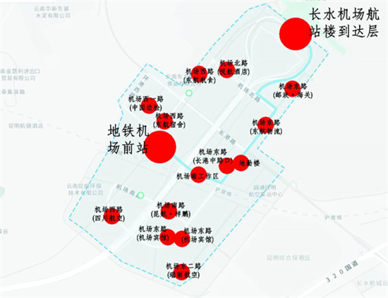 运营初期在长水国际机场工作区内的服务站点为:长水机场航站楼到达层、机场东路(邮政·海关)、机场东路(东航物流)、机场东路(长港中路口)、地勤楼、机场南工作区、机场南路(昆航·祥鹏)、机场东路(机场宾馆)(一对站)、机场东二路(瑞丽航空)、机场西路(四川航空)、地铁机场前站、机场西路(东航宿舍)、机场西一路(中国边检)、机场西路(东航航食)、机场北路(悦航酒店),后续运营时间和服务站点可根据乘客的实际需求进行优化调整。