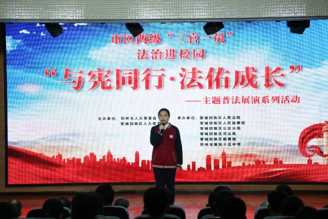 在“12・4”国家宪法日即将到来之际,郑州市管城回族区人民法院联合管城区检察院、区公安分局、区司法局、郑州市第四十五中学等多家单位共同开展“三官一员”法治进校园活动。