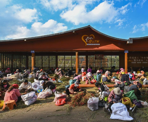“挪一挪,让出一条道来,里面还有位置。”宣威市零工市场复兴站点运营经理马正稳一大早便忙得不可开交。130平方米的服务大厅挤满了加工辣椒的群众,他一边说着一边收拾桌椅给大家伙腾位置,“平时天气好,大家都在院子里做工,今天忽然下雨,休息长廊和工棚都挤不下了。”放眼望去,成堆的辣椒秆、遍地的红辣椒、攒动的人群,零工市场瞬间变成了务工车间。