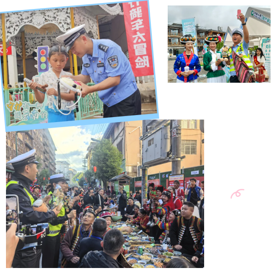 宣传小分队每到一个地方,都会为旅居云南的朋友们送上交警版“旅游伴手礼”;泼水节、火把节、长街宴上,宣传小分队将欢庆后的安全行车叮嘱送给五湖四海的朋友们;在丽江泸沽湖畔、怒江峡谷中、迪庆雪山上,宣传小分队为游客们送上高原地区、临水临崖路段行车指南。“遇到你们,为我的迪庆之旅带来了意外之喜。”游客卢女士说。