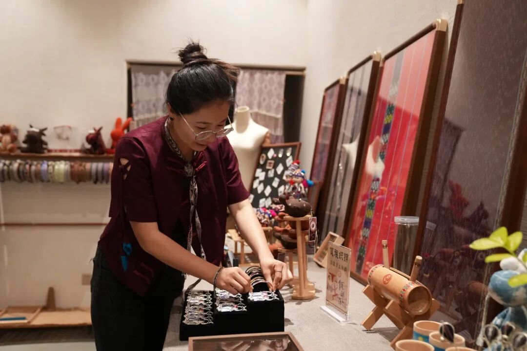 在西盟县城的佤族织锦工作室里,廖静文正在赶制一批新订单,货架上,织锦化妆镜、杯套、耳钉等文创产品精致亮眼。