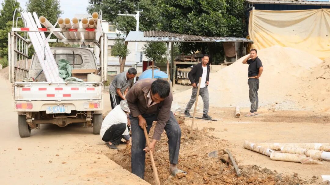 走进崇岗乡包山村歇马场自然村,一幅热火朝天的施工画卷跃然眼前。施工人员各司其职、默契配合,有的手持铁锹开挖沟渠,有的细致铺设管道,有的专注粉刷污水处理池外墙;村民们也自发赶来搭把手,或传递物料或协助清理,干劲十足。整个施工现场分工有序、忙而不乱,处处洋溢着共建家园的实干气息。