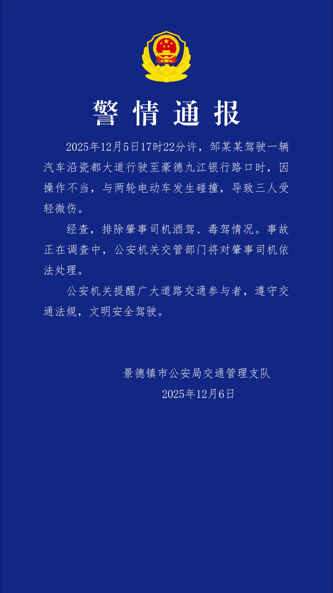央视网消息:江西景德镇市公安局交通管理支队12月6日发布警情通报:2025年12月5日17时22分许,邹某某驾驶一辆汽车沿瓷都大道行驶至豪德九江银行路口时,因操作不当,与两轮电动车发生碰撞,导致三人受轻微伤。经查,排除肇事司机酒驾、毒驾情况。事故正在调查中,公安机关交管部门将对肇事司机依法处理。
