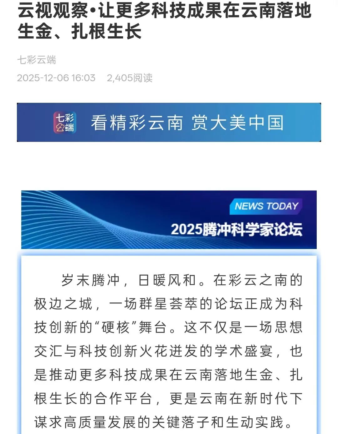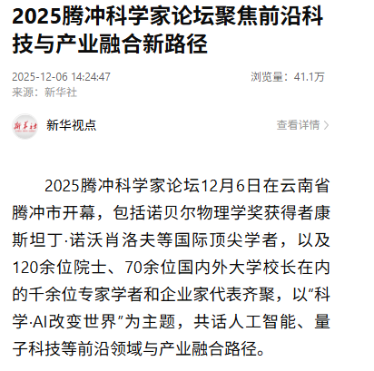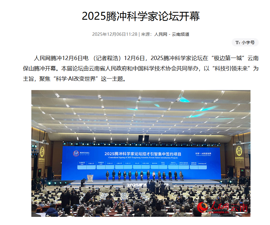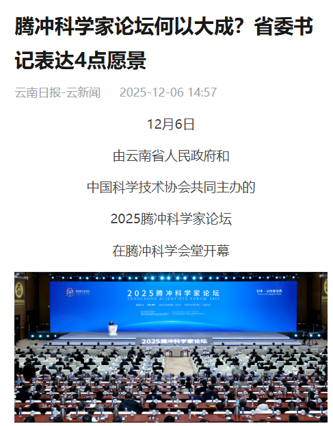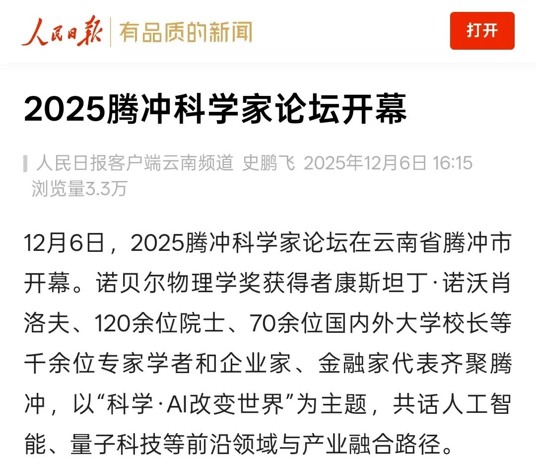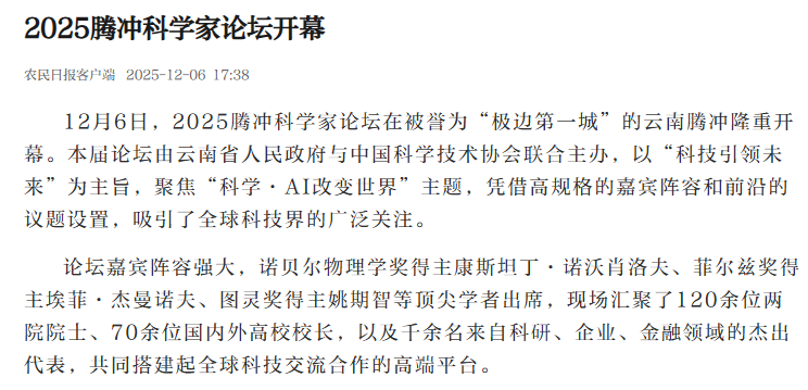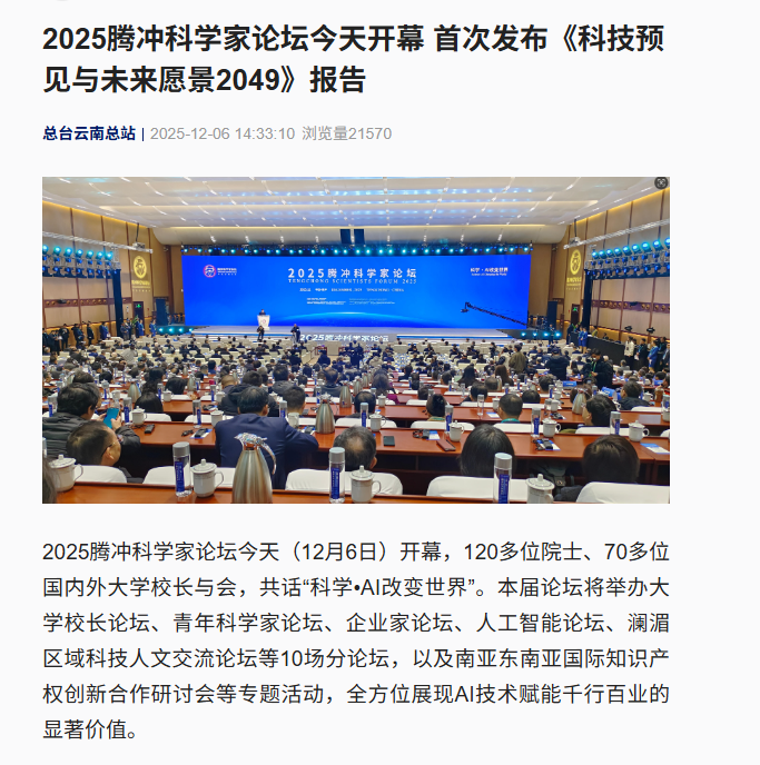2025腾冲科学家论坛今天(12月6日)开幕,将举办大学校长论坛、青年科学家论坛等10场分论坛,与会的120多位院士、70多位国内外大学校长围绕“科学·AI改变世界”这一主题展开探讨交流。