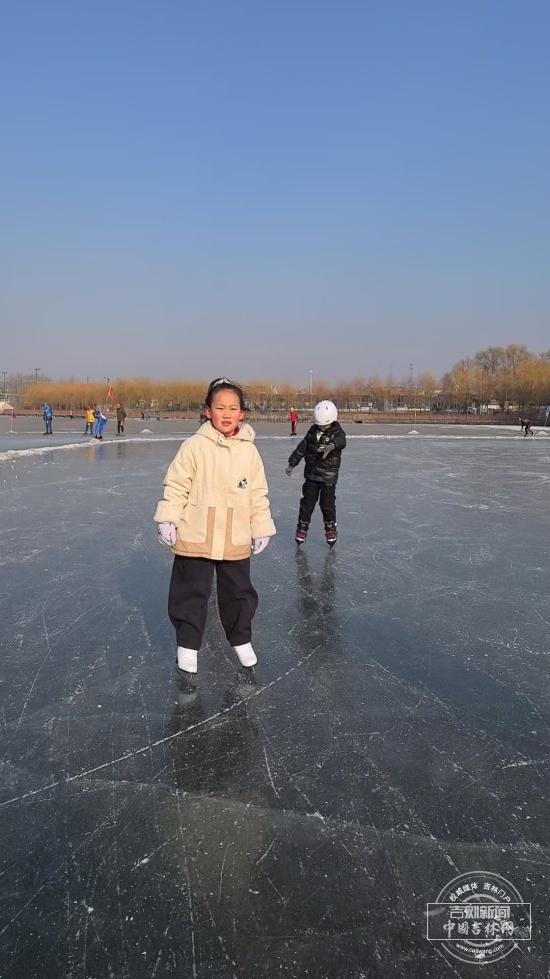 夕阳为冰面镀上金边,也将老少身影拉得修长。老人的动作从容而沉稳,孩子的滑行虽带稚嫩却充满勇气。他们一同划出的弧线,仿佛时间的笔触,一头连着沉淀的岁月,一头牵着蓬勃的未来。