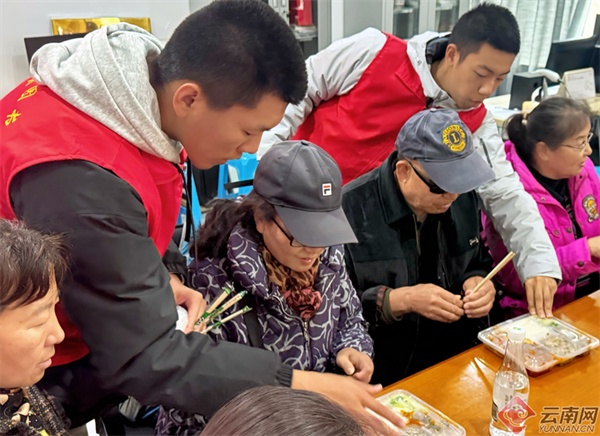 当队伍到达云南省图书馆视障阅览室时,午餐已经准备完毕,志愿者细心地为行动不便的视障群众摆好餐具、倒好热水,询问大家的饮食需求。“饭菜很可口,温度也刚好”“谢谢你们这么贴心,考虑得太周到了”,视障群众一边用餐,一边向志愿者表达着感谢。