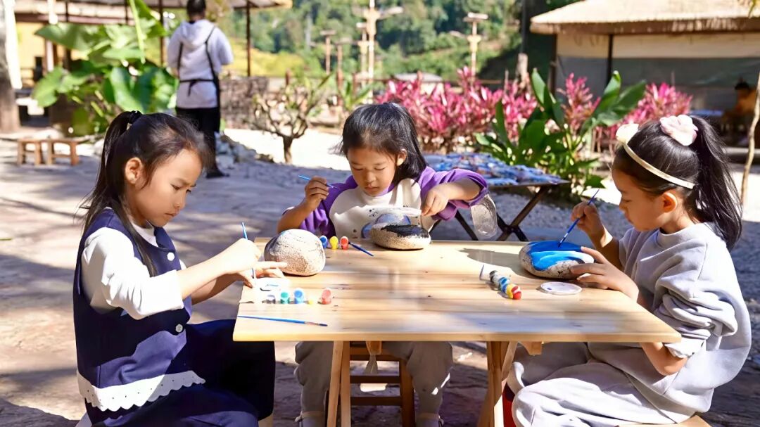 另一边,木依吉神谷的崖壁上,图腾生动展现了佤族先民狩猎、祭祀、舞蹈的生活图景。亲子崖画体验活动在此悄然展开,游客们可携孩子挑选石块,用缤纷的现代颜料,在粗粝的石块上与千年前的佤族先民展开一场跨越时空的对话。