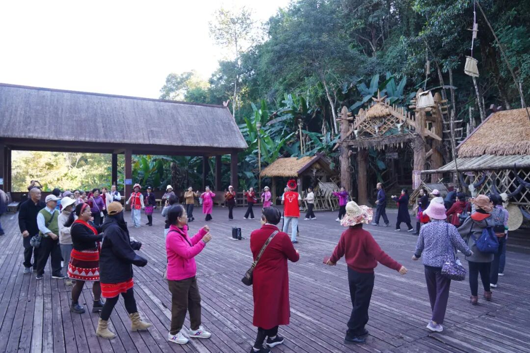 风光秀丽的龙潭湖、神秘的龙摩爷圣地,在周末的最后一日,迎来一群来自远方的游客。他们在龙潭湖畔悠闲漫步,在绿树成荫的栈道间穿行,在成片的牛头桩林间体验佤族文化,在青山环抱下手拉手跳起佤族“圈圈舞”。