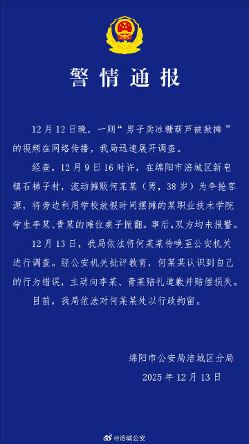 央视网消息:四川省绵阳市公安局涪城区分局12月13日晚发布警情通报:12月12日晚,一则“男子卖冰糖葫芦被掀摊”的视频在网络传播,我局迅速展开调查。经查,12月9日16时许,在绵阳市涪城区新皂镇石梯子村,流动摊贩何某某(男,38岁)为争抢客源,将旁边利用学校放假时间摆摊的某职业技术学院学生李某、青某的摊位桌子掀翻。事后,双方均未报警。12月13日,我局依法将何某某传唤至公安机关进行调查。经公安机关批评教育,何某某认识到自己的行为错误,主动向李某、青某赔礼道歉并赔偿损失。目前,我局依法对何某某处以行政拘留。