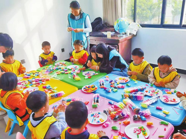 “爱心妈妈”与留守儿童一起做手工。 通讯员 郭洁 摄