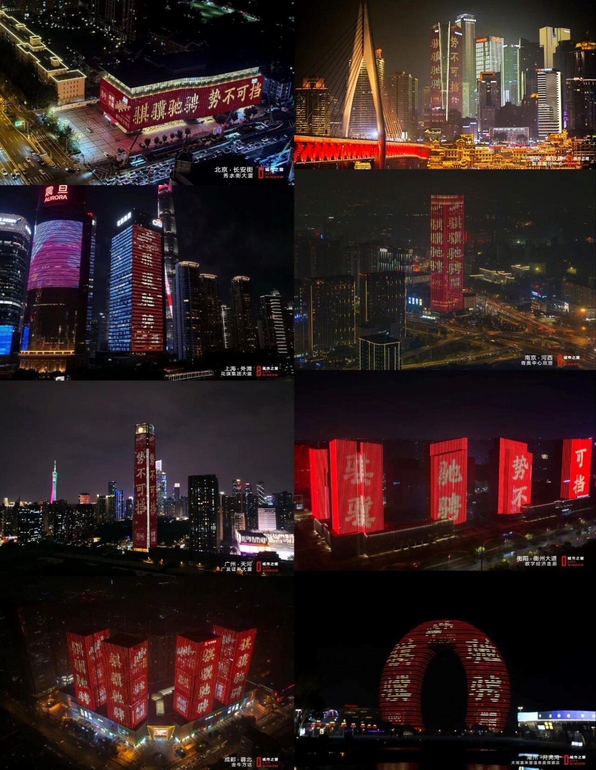 “城市之窗”在北京、上海、广州、南京、成都、重庆、湖州、衡阳八个城市地标楼宇点亮“春晚红”。