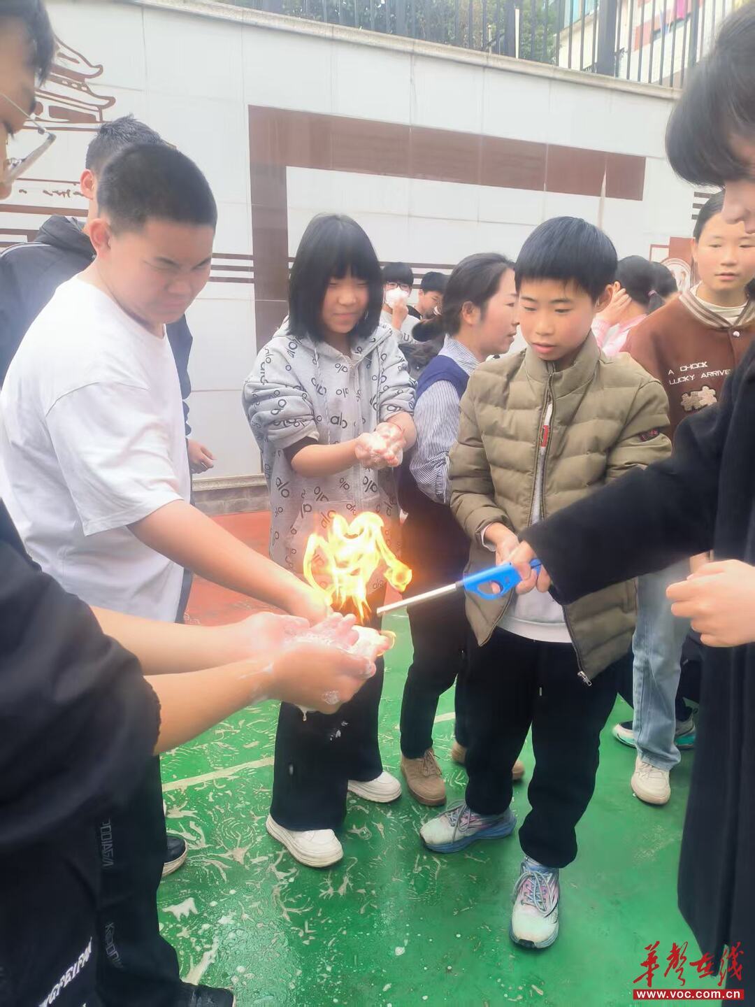 化学组的实验则充满了“视觉冲击”。火焰掌实验中,教师在安全范围内演示操作,手掌蘸取特殊溶液后点燃,蓝色火焰包裹手掌却不伤人,让学生惊叹不已;面粉爆炸实验通过简单装置模拟粉尘爆炸现象,直观展现了化学变化的威力。同时,教师强调了粉尘爆炸的安全隐患,引导学生树立安全意识。实验过程中,学生认真观察、积极提问,对化学知识的好奇心被充分激发。
