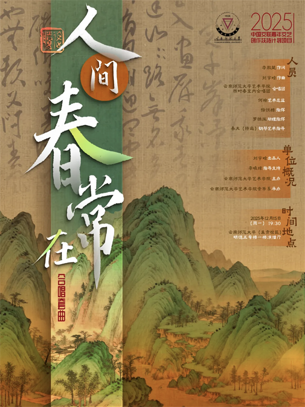 云南网讯(记者 赵岗)当合唱的韵律邂逅春城的千年文脉,一幅融汇历史记忆与人间烟火的音画长卷,在观众的眼前与耳畔徐徐展开……12月15日晚,由云南省文联、云南省音乐家协会推荐报送的中国文联青年文艺创作扶持计划支持项目——合唱套曲《人间春常在》首演音乐会在云南师范大学(呈贡校区)圆满落下帷幕。