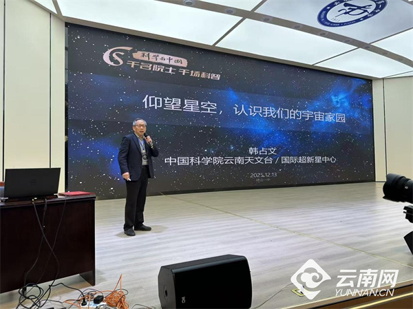 12月13日下午,“科学与中国-千名院士·千场科普”首场启动报告在保山第一中学举行。中国科学院院士、云南天文台研究员韩占文以《仰望星空,认识我们的宇宙家园》为题,为1500名学生代表带来一场生动精彩的天文科普报告。韩院士以通俗的语言、丰富的影像资料,系统讲解了星空认知、恒星研究、宇宙测量及未来展望等内容,并与学生亲切互动,耐心解答提问,在轻松愉快的氛围中激发了青少年对宇宙科学的浓厚兴趣。