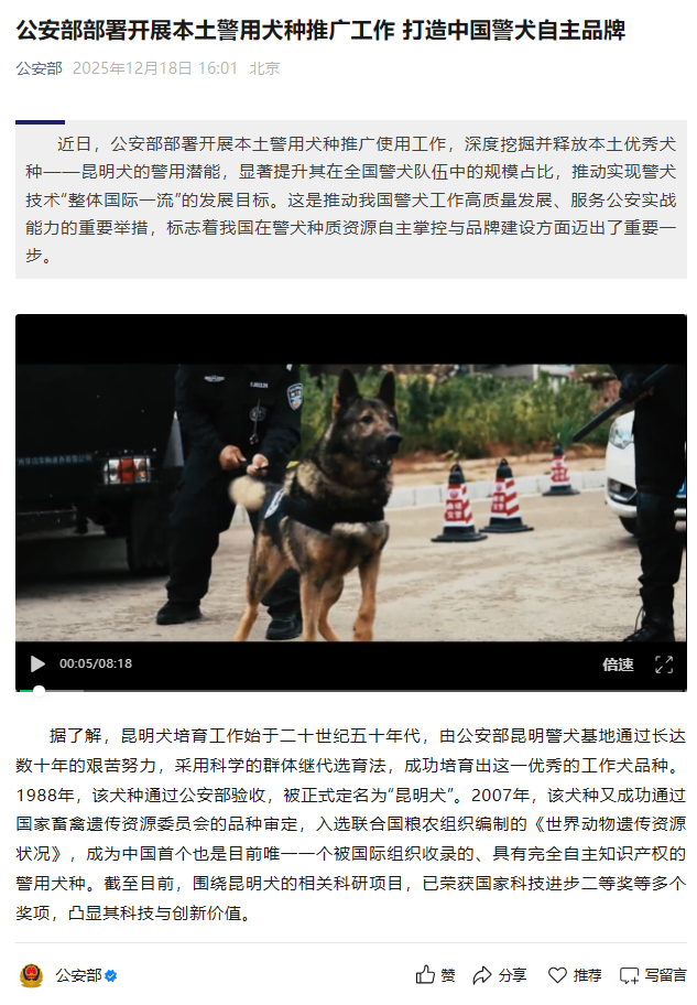 近日,公安部部署开展本土警用犬种推广使用工作,深度挖掘并释放本土优秀犬种——昆明犬的警用潜能,显著提升其在全国警犬队伍中的规模占比,推动实现警犬技术“整体国际一流”的发展目标。这是推动我国警犬工作高质量发展、服务公安实战能力的重要举措,标志着我国在警犬种质资源自主掌控与品牌建设方面迈出了重要一步。