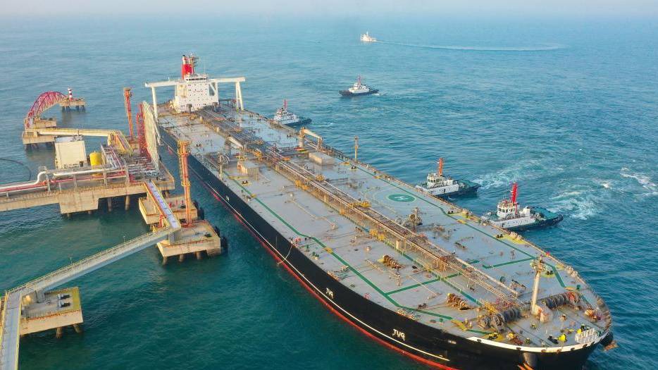 12月18日,一艘装载着17.9万吨石化原辅料的船舶泊入国投洋浦油储码头30万吨级原油泊位(无人机照片)。