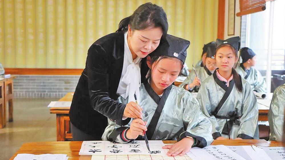 李青霖指导“小爨娃”书法班学生习爨体字。曲靖市第二小学 供图