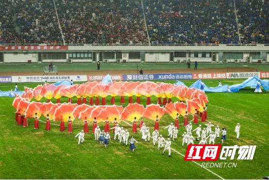 当足球的中场哨声响起,绿茵场悄然变身为舞台。12月20日湘超联赛半决赛的长沙主场,长沙VS永州的焦点大战万众瞩目,在中场休息时间,一场特殊的“文化快闪”正在上演。由《寻·长沙》《江天暮雪》《恰同学少年》《新刘海砍樵》等一批长沙代表性文旅演艺作品联袂呈现湖湘文化的历史脉络与精神气质。其中,《江天暮雪》将古典诗画的意境进行舞台化还原,在光影流转中呈现山水诗境;《恰同学少年》回望革命岁月,重现热血激昂的青春记忆;《寻长沙》则以沉浸式叙事方式,带领观众在片段式体验中读懂城市的历史与文脉。