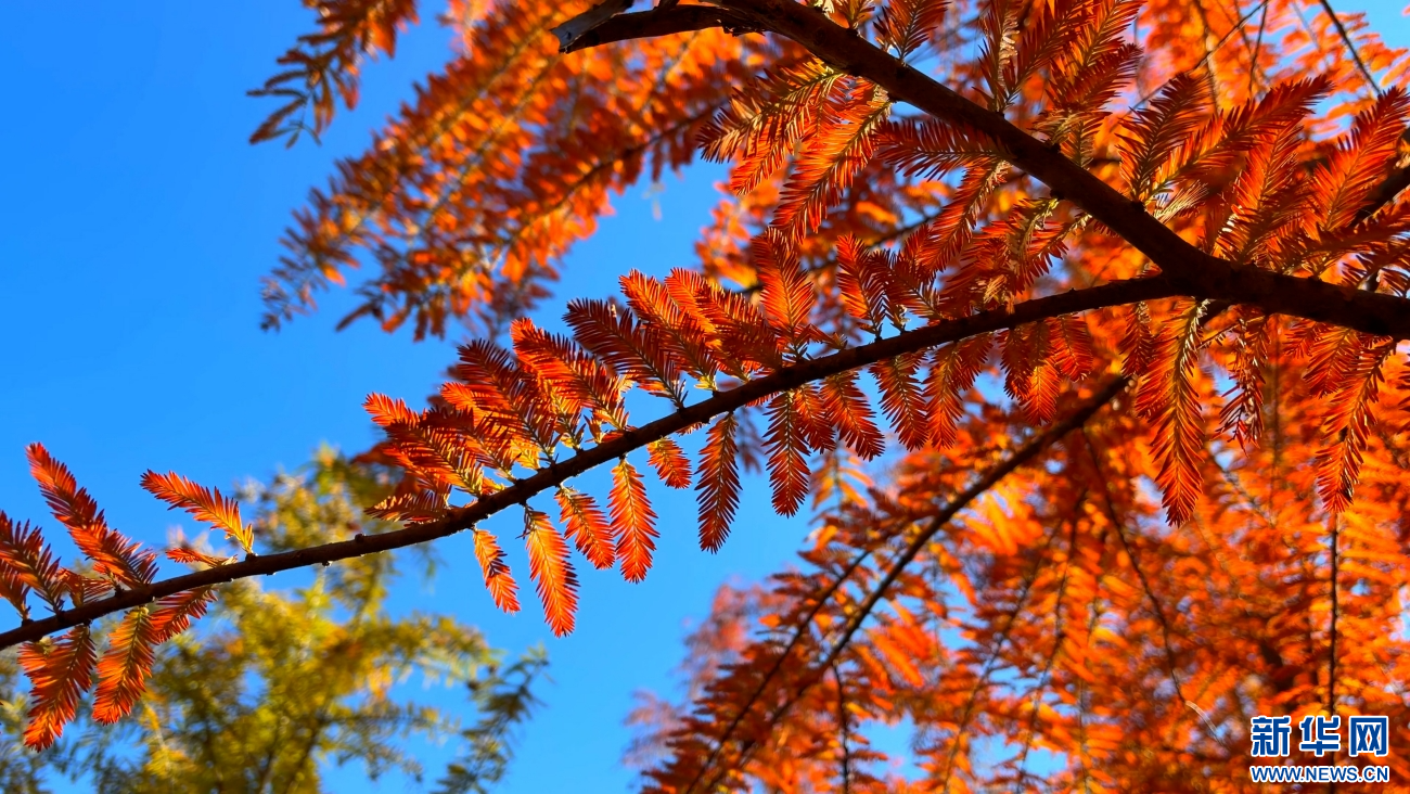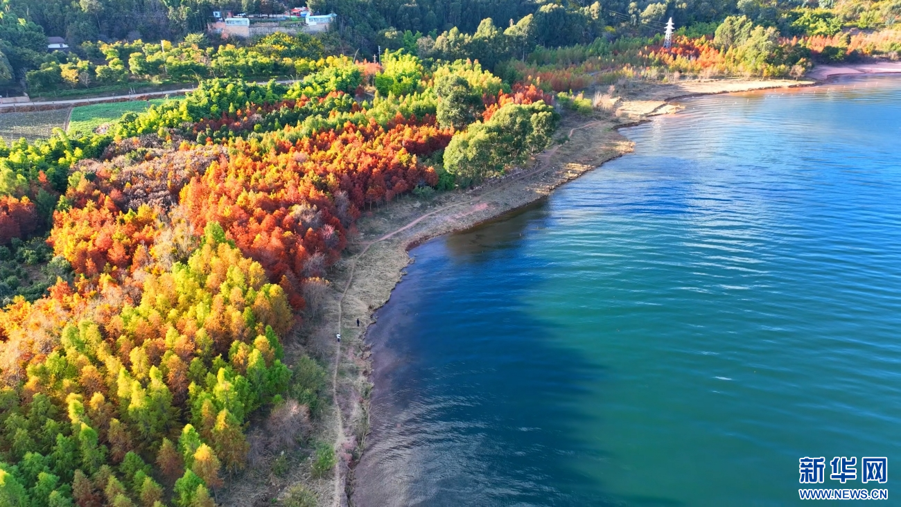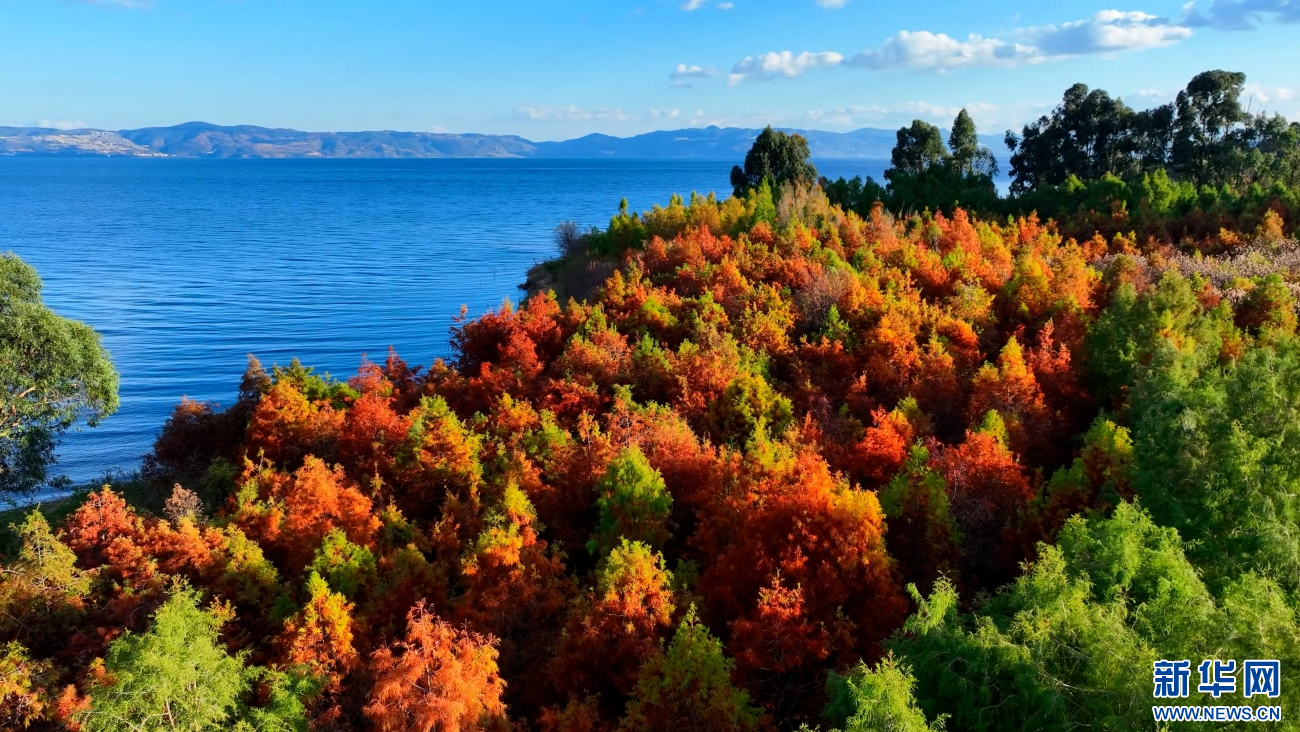冬日的抚仙湖,澄澈湖水与斑斓水杉相映成趣。(视频截图)