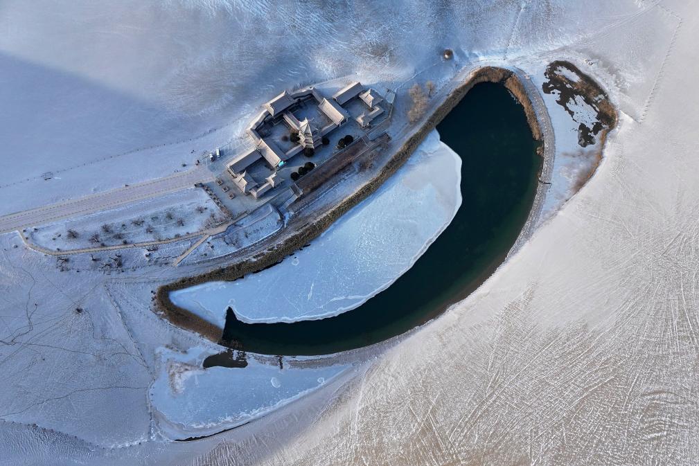 这是在甘肃省敦煌市鸣沙山月牙泉景区拍摄的月牙泉雪景(无人机照片)。新华社发(张晓亮 摄)