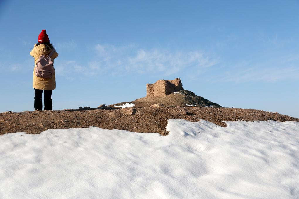 游客在雪后的甘肃省敦煌市阳关景区拍照游览。新华社发(张晓亮 摄)