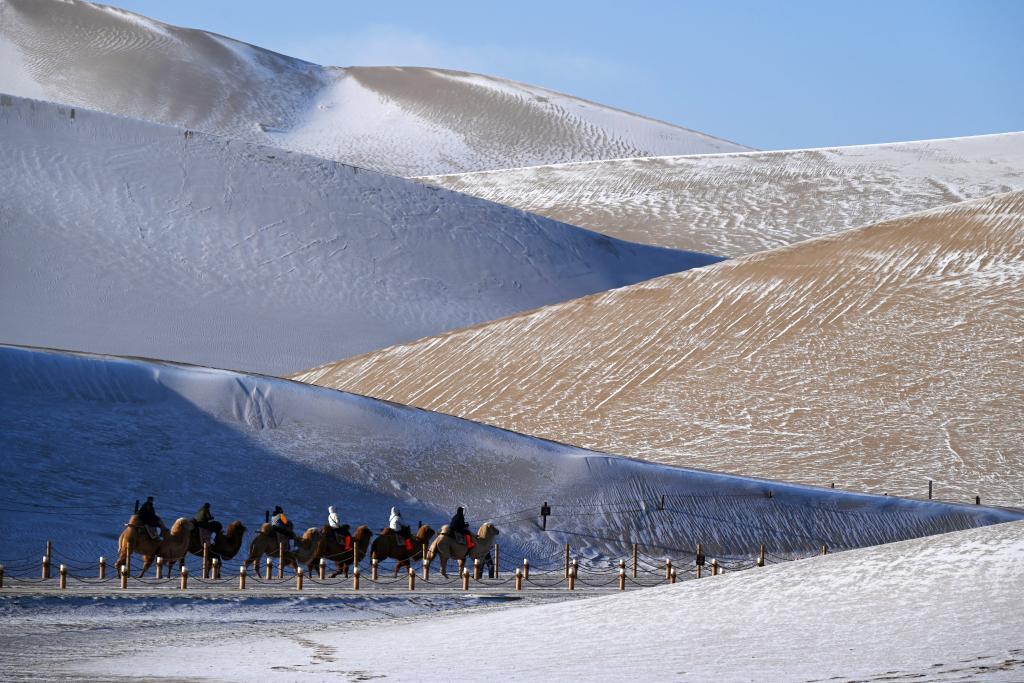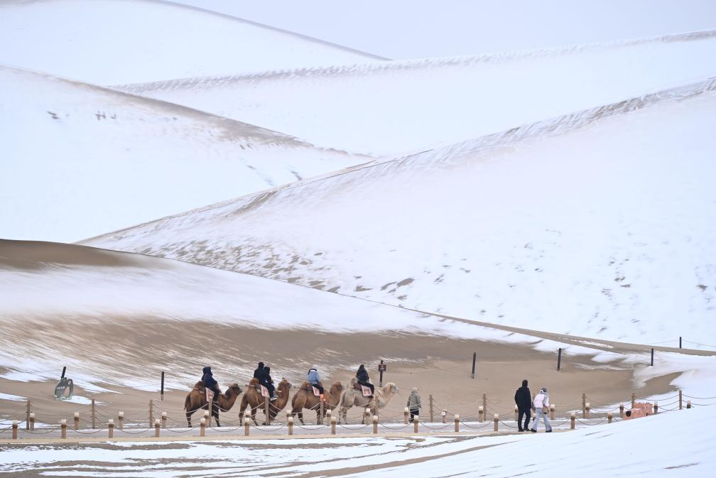 游客在甘肃省敦煌市鸣沙山月牙泉景区骑骆驼,观赏雪景。新华社发(张晓亮 摄)