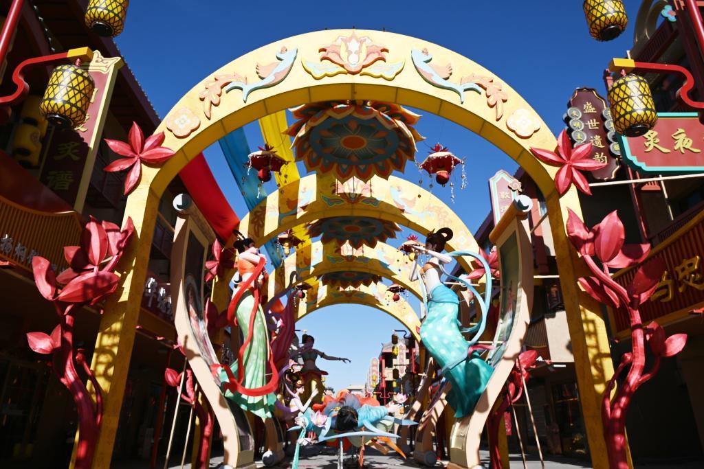 这是在敦煌夜市拍摄的特色花灯安装布置现场。新华社发(张晓亮 摄)