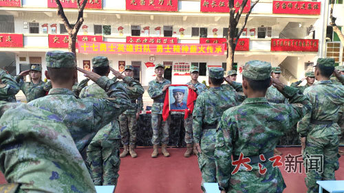 “爷爷终于‘回到’了当年和战友并肩战斗的连队,我为他感到高兴!”当天,面对“大渡河连”全连官兵,熊尚林烈士的侄孙熊鹤鸣手捧画像激动地说。