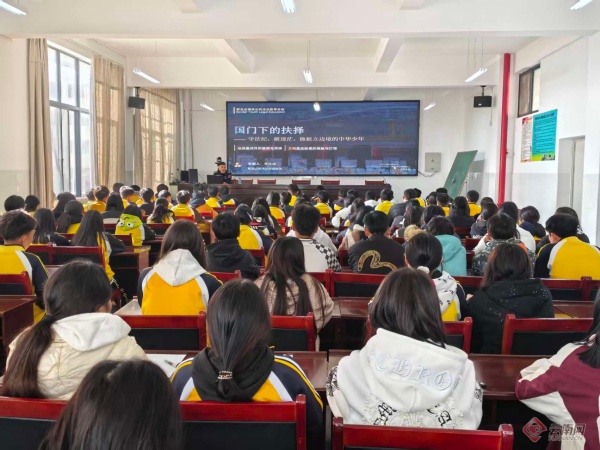 活动以“国门下的扶择”法治宣讲拉开帷幕,派出所副所长紧扣“守法纪、破迷茫,做挺立边境的中华少年”这一核心,结合边境地区的治安特点,聚焦跨境违法犯罪、网络安全等高频风险点,通过大屏课件展示真实案例,把晦涩的法律条文转化为贴近学生生活的生动故事。那些发生在边境线上的鲜活事例,让同学们直观地认识到违法犯罪的危害,也明白了守护边境安全的重要意义。