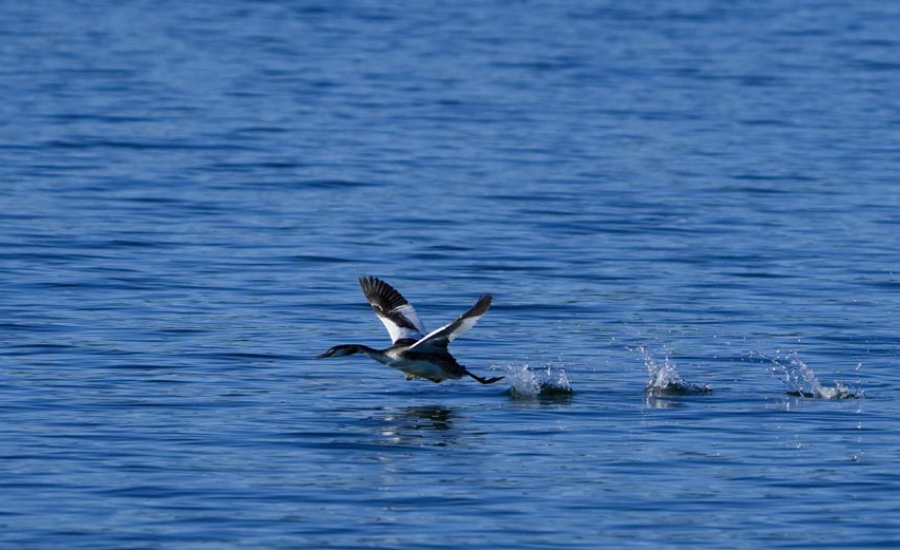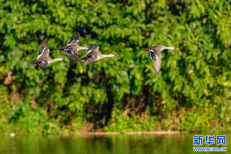 在水面低飞的斑嘴鸭(12月27日摄)。新华网发(方雯青 摄)