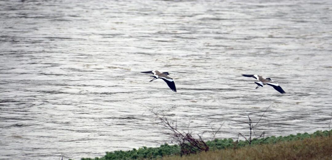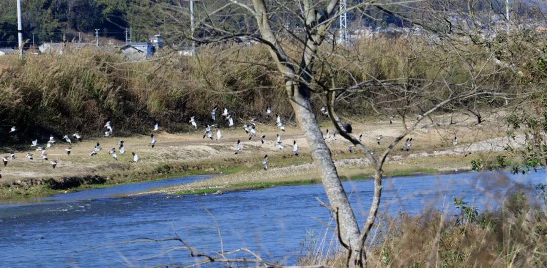 成群的白鹭、钳嘴鹳或在浅滩觅食或展翅翩飞