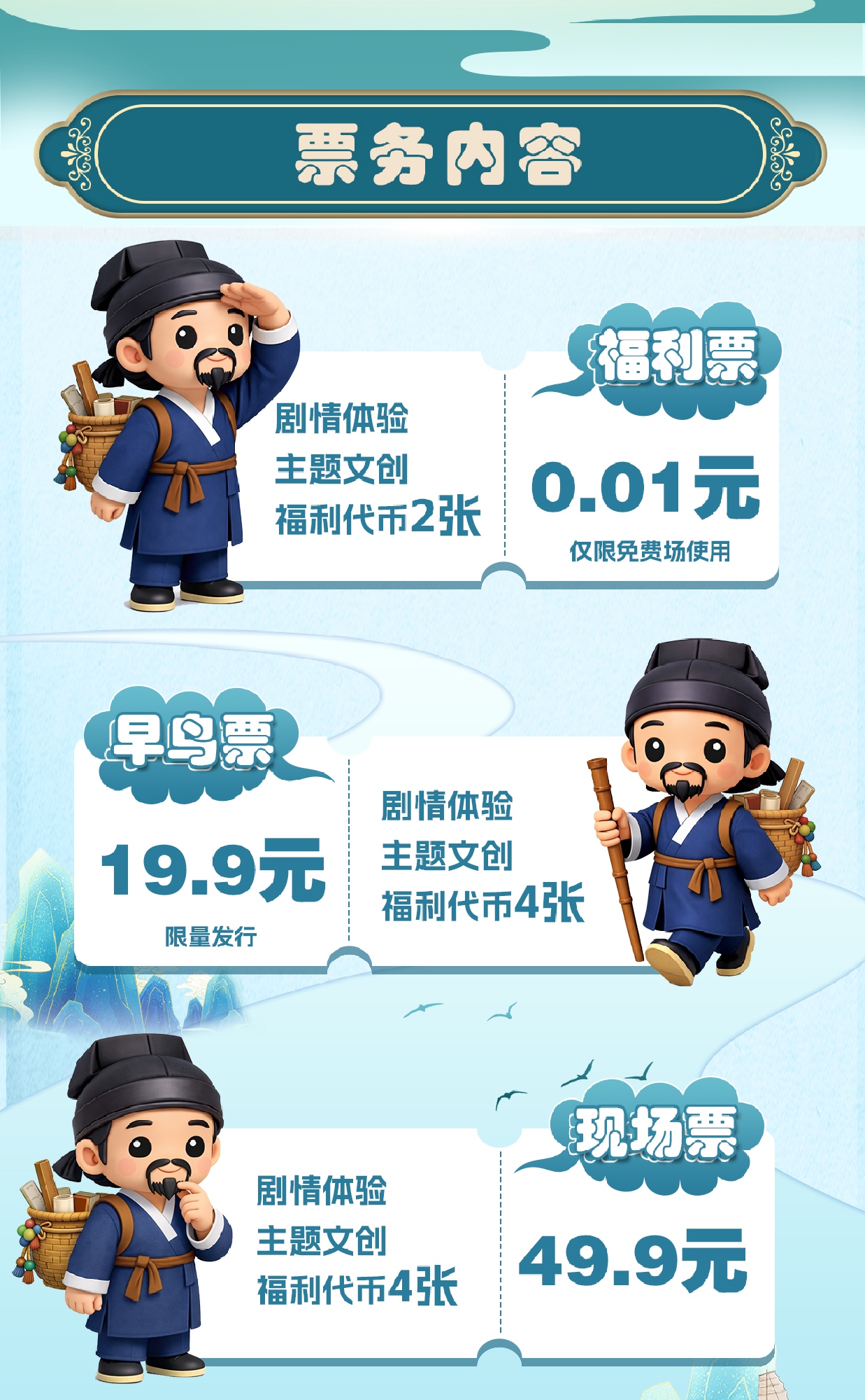 该剧本游活动将于1月的每个周末在大观楼近华浦景区开展。市民和游客搜索微信小程序“讲武文创”或点击页面中购票链接即可预约购票。每场限量40人次,儿童与成人同票价,低于1.2米儿童需有成人陪同参与。每日12:30开始,每小时开展一场演绎至闭园。每日共计6场。其中最后两场为福利场,仅用0.01元即可体验剧情,并获得纪念品及2张“银票”代币。完整体验票价为49.9元,内含价值40元的4张可在大观公园内合作商家点位消费的“银票”,一份价值40元的主题定制文创产品,价值10元的专属AI互动集章卡。限量早鸟票正在发售,待遇与完整体验票一致,售价19.9元。