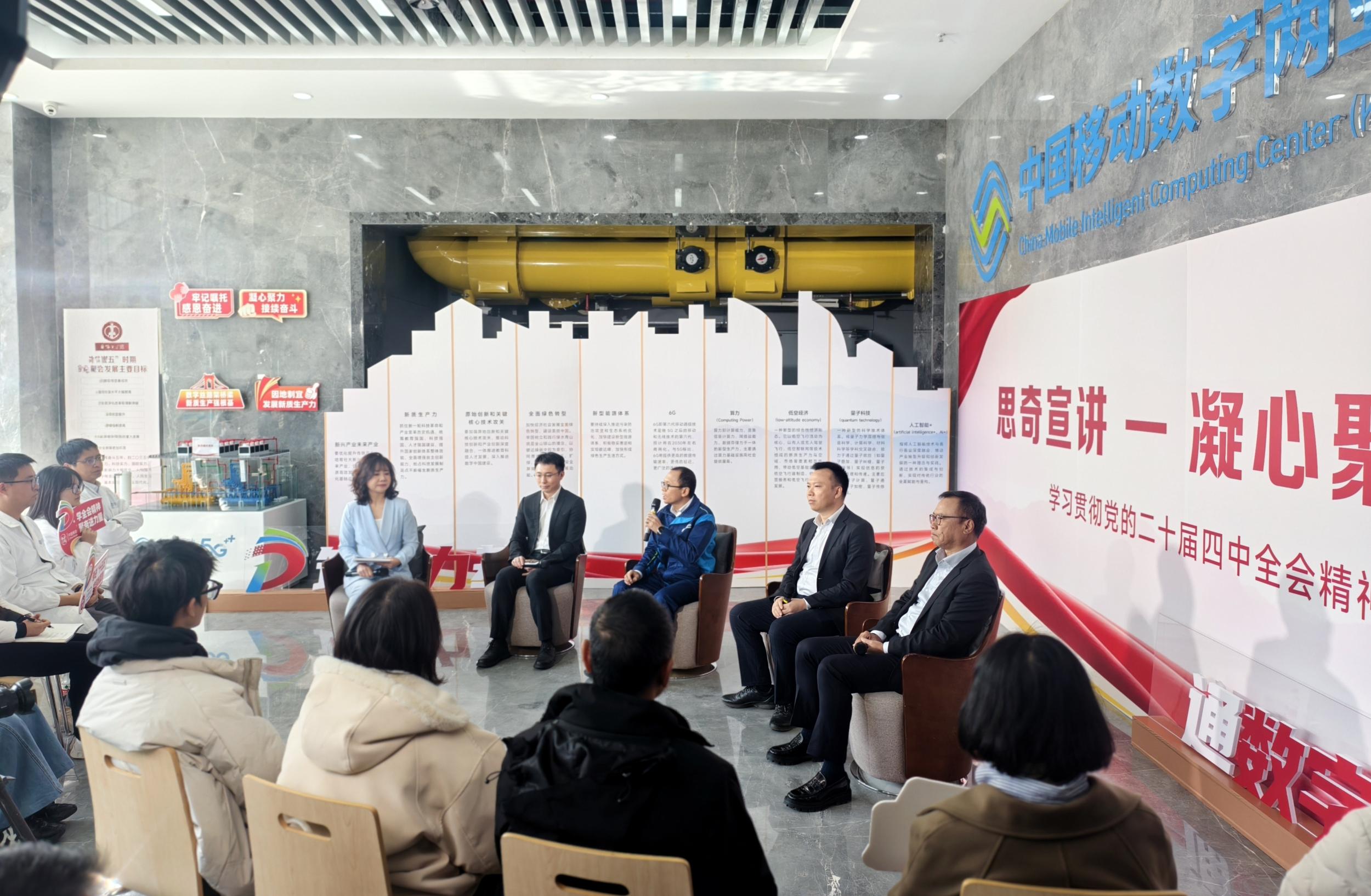 “算力像数字时代的‘水电煤’,是数字经济时代的核心生产力和基础支撑。大到教育、医疗、社保、养老,算力在不断赋能千行百业,改变生活。”2025年11月25日,“思奇宣讲—凝心聚力 接续奋斗”学习贯彻党的二十届四中全会精神主题宣讲活动走进中国移动数字两亚(昆明)智算中心,宣讲员现场解读党的二十届四中全会对“算力”和“新型基础设施建设”作出的新部署。
