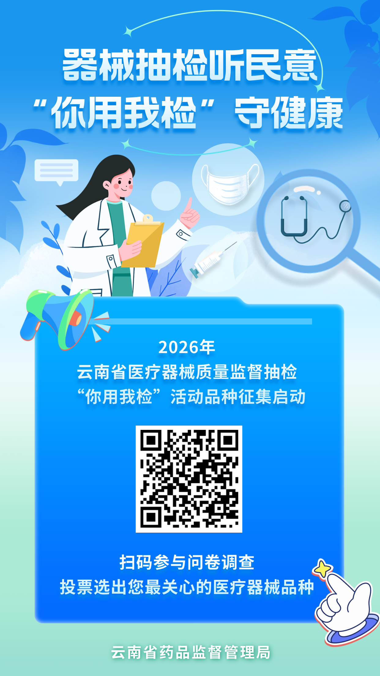 即日起,公众可关注“云南药品监管”微信公众号,通过问卷投票选出自己最关心、最想抽检的医疗器械品种。投票选出的品种,将被纳入省级质量监督抽检计划,检验结果将及时向社会公布。