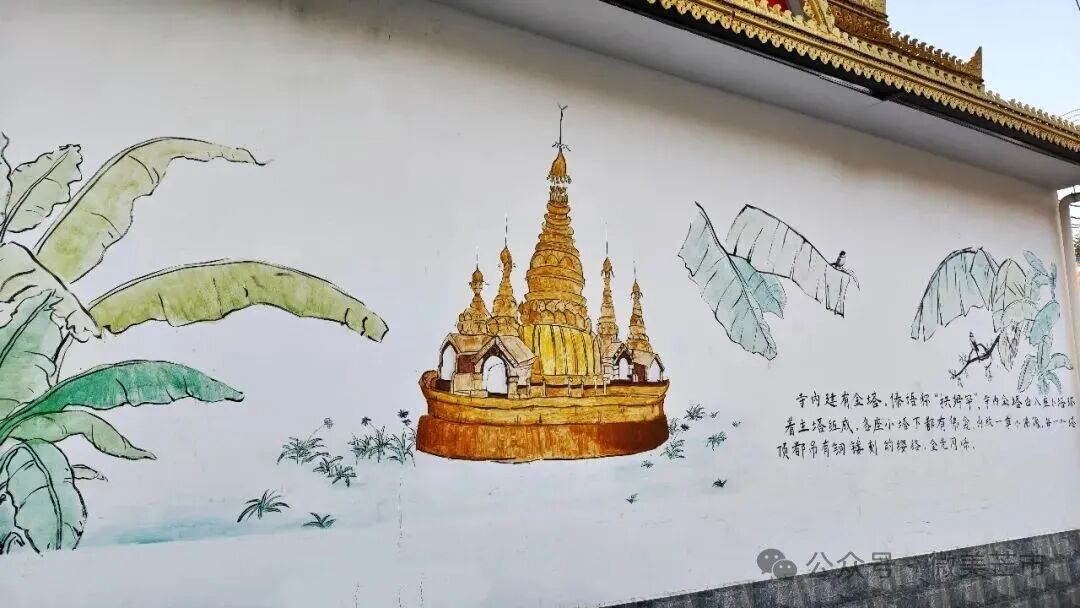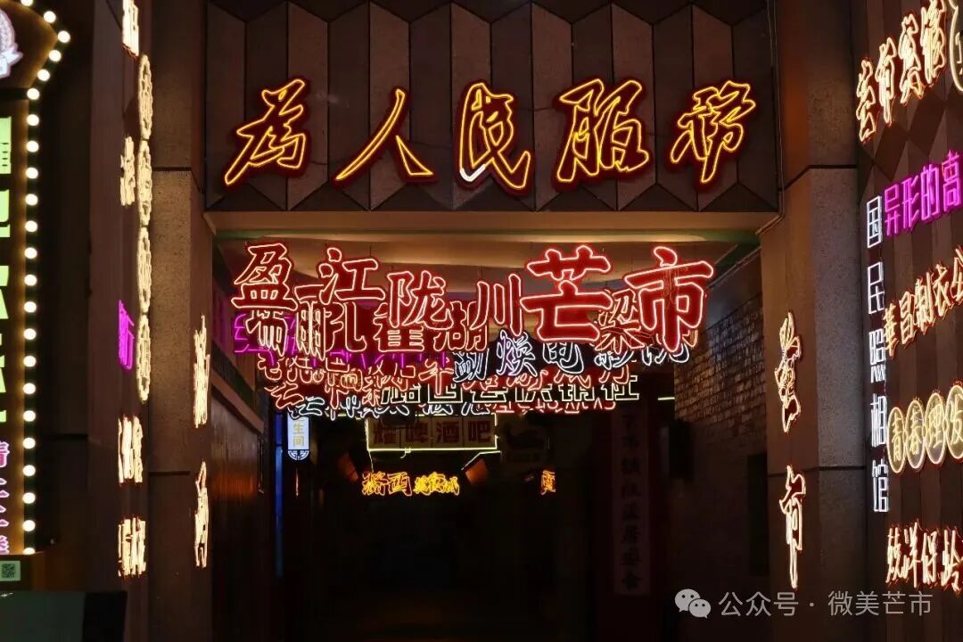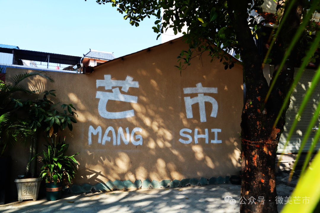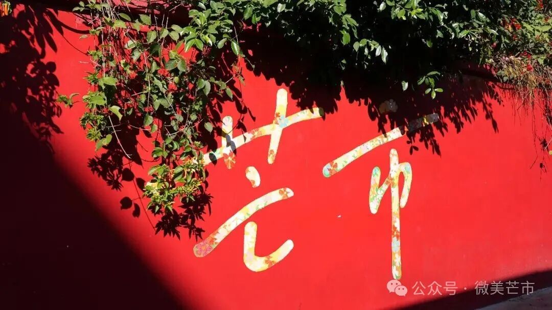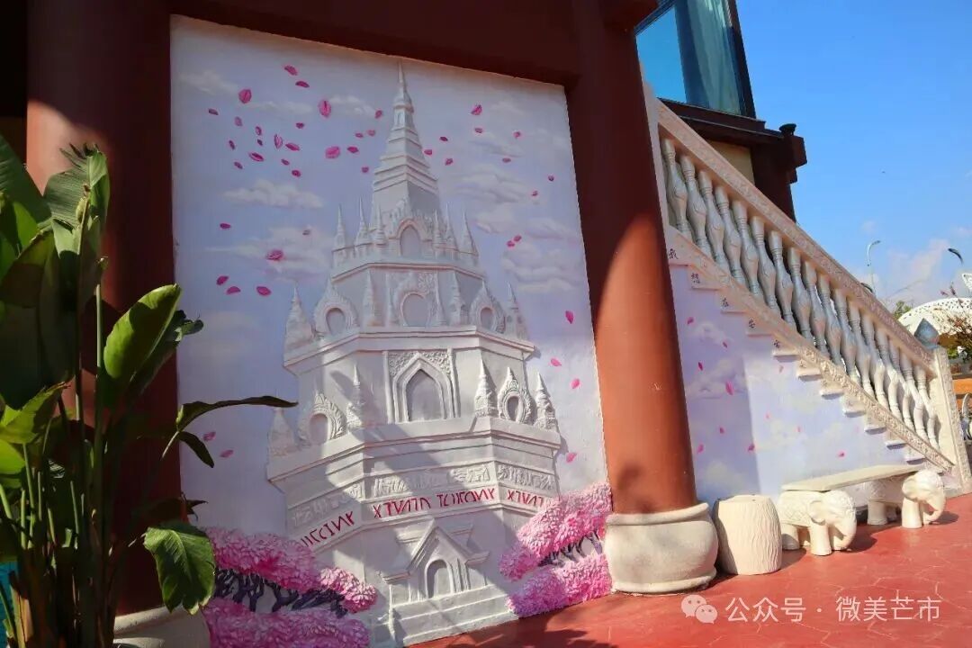 世纪酒店旁的红墙上,“芒市”两个字和垂落的炮仗花一起明媚摇曳;街角的绿荫里,花体字衬着鸡蛋花与芭蕉叶,静静散发着民族的气息;傣族古镇的民宿外,浮雕佛塔与花瓣雨相映,仿佛连空气都是香的;夜晚的新玩厂,老厂房上的霓虹字亮着暖光,烧烤摊、糖水铺的热闹好像都藏在笔画里——旧时光与新生活,就这样轻轻相拥。
