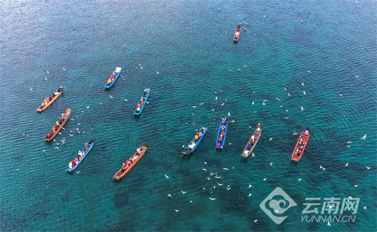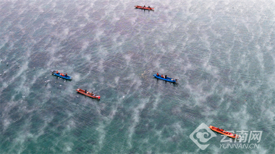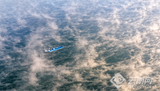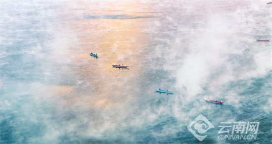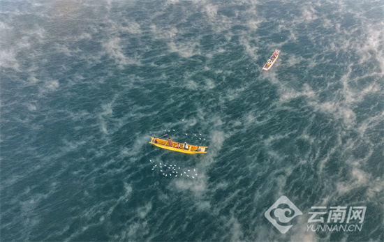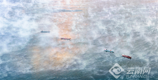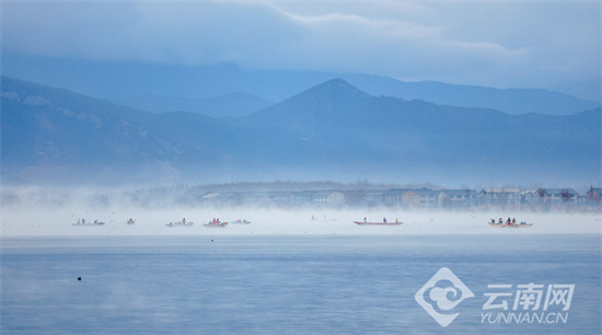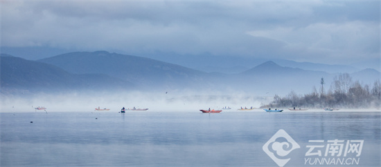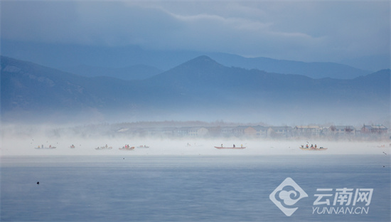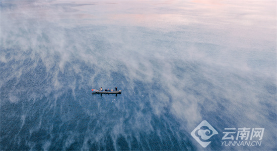 清晨,冬日的泸沽湖在静谧中缓缓醒来。在云南丽江泸沽湖景区浪放码头,湖面升腾起轻柔的薄雾,将远山与湖岸轻轻包裹。在轻盈缥缈的晨雾中,当地摩梭人摇着猪槽船,唱着山歌,带着远方的客人沉浸式体验“人在画中游”的诗情画意。