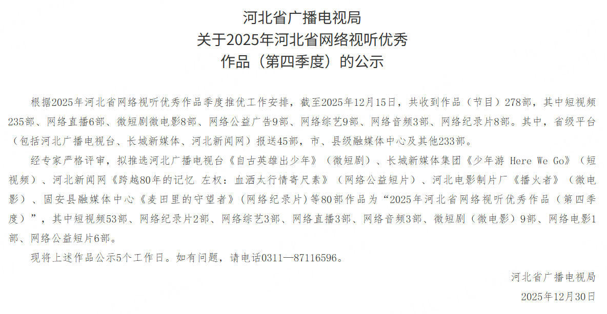 近日,纵览传媒笔尖短剧工作室制作的反诈微短剧《儿子来电》获得多项荣誉,在“首届京津冀微短剧征集推介”活动中,获得微短剧“作品入围奖”。此外该剧还荣获“2025年河北省网络视听优秀作品(第四季度)”。