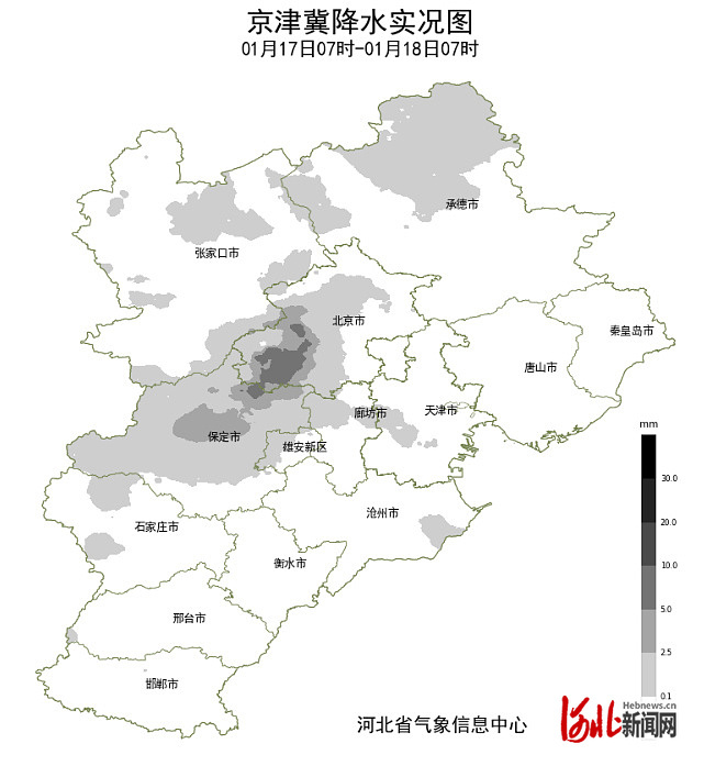 据河北省142个国家级气象站数据统计,1月17日7时至18日7时,张家口中北部、承德北部、保定、雄安新区、廊坊西部、石家庄中西部等地有25个站点出现降雪天气,降水区平均降水量为0.9毫米,保定易县最大为3.8毫米达中雪级别。石家庄城区出现微量降雪。