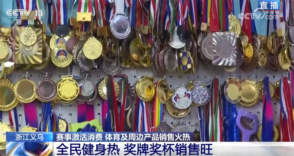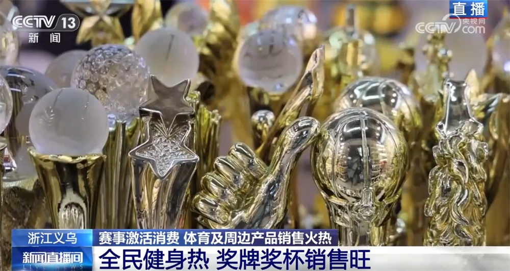 在市场里,记者还注意到一个特别有意思的变化——不光是世界杯要来了,像“苏超”“浙BA”这些地方联赛也办得火热。再加上全民健身越来越受欢迎,有一类体育周边也跟着卖火了。您看这家店,奖杯、奖牌成了实实在在的“刚需”。有商户跟记者说,以前这类订单主要来自国外客户或者大型赛事,但从去年到现在,他们接到的“小订单”明显变多了。比如“镇超”“村超”,还有“镇BA”,甚至“楼BA”……各种各样的基层体育赛事越来越多,这些奖杯奖牌也走进了更多人的体育生活里。