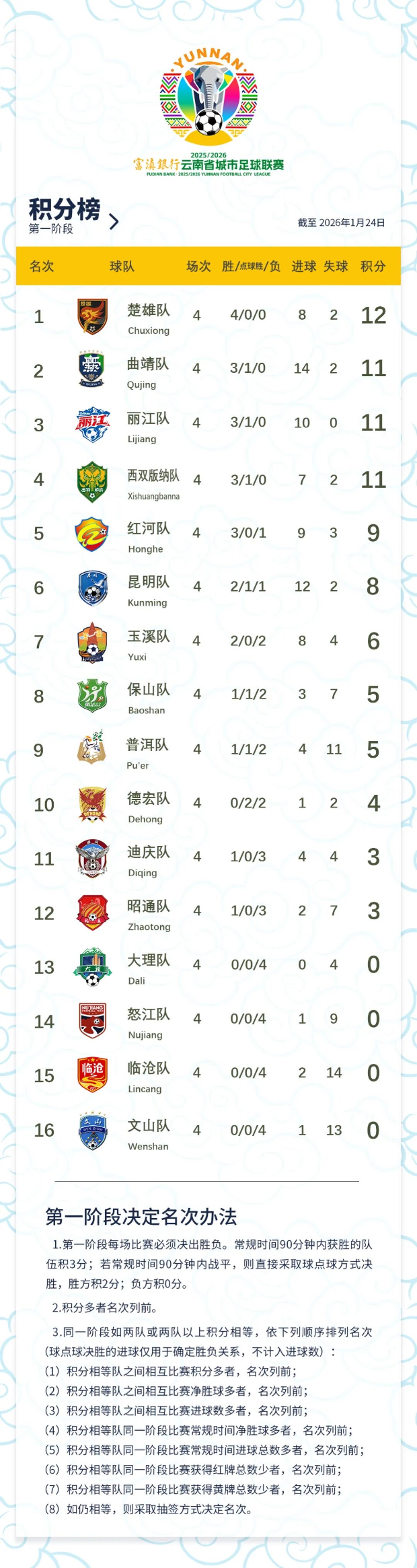 云南网讯(记者 贺凯)1月24日,2025/2026富滇银行云南省城市足球联赛在经历新一轮激烈角逐后,公布了最新积分榜。楚雄队凭借出色的发挥,以四场全胜积12分的傲人战绩,强势领跑积分榜。