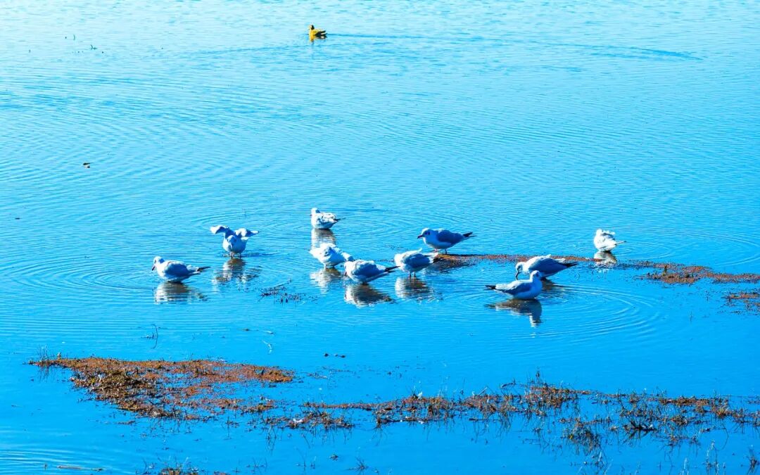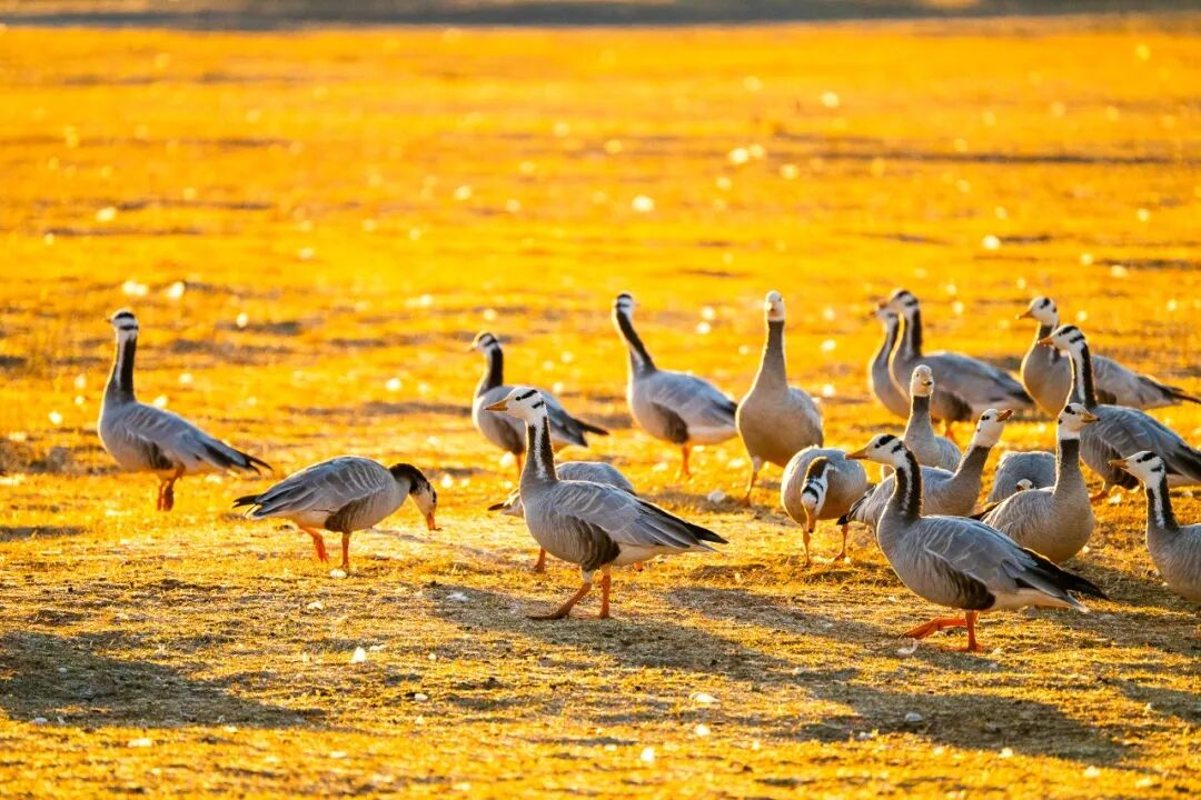 广阔的湖滩,在冬日阳光的照耀下,呈现出温暖的金黄色调。成群结队的斑头雁在岸边的草甸上休憩,或伫立凝望,或低头觅食,神态悠闲。而在波光粼粼的湖面上,绿头鸭等水鸟正惬意地游弋划水,为冬日的高原增添了无限生机。