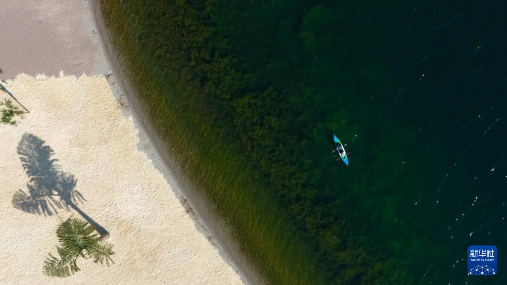 1月27日,游客在云南省玉溪市抚仙湖划船游玩(无人机照片)。新华社记者 高咏薇 摄
