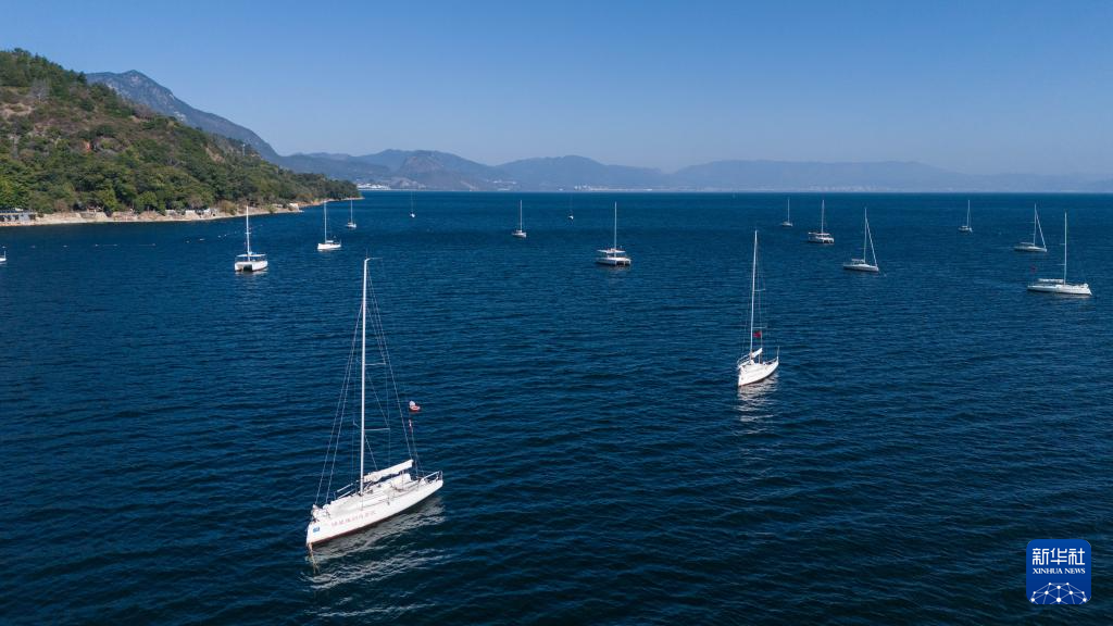1月27日在云南省玉溪市拍摄的抚仙湖上的游船(无人机照片)。新华社记者 高咏薇 摄