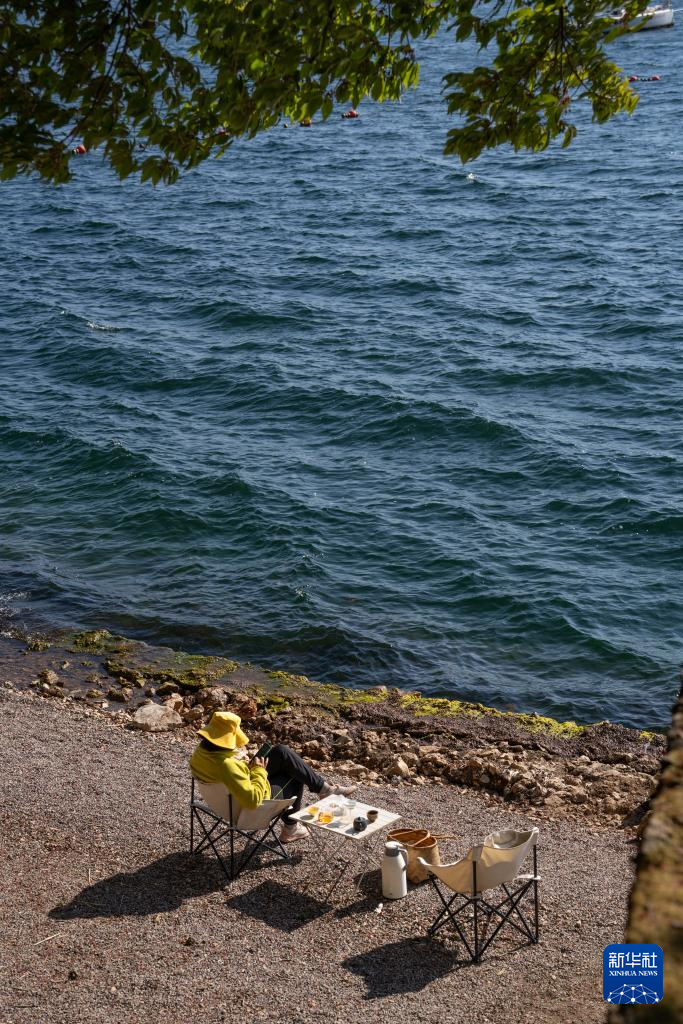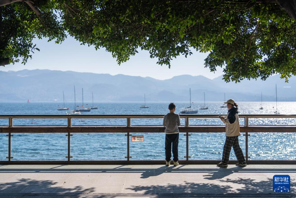 1月27日,游客在云南省玉溪市抚仙湖畔休闲。新华社记者 高咏薇 摄