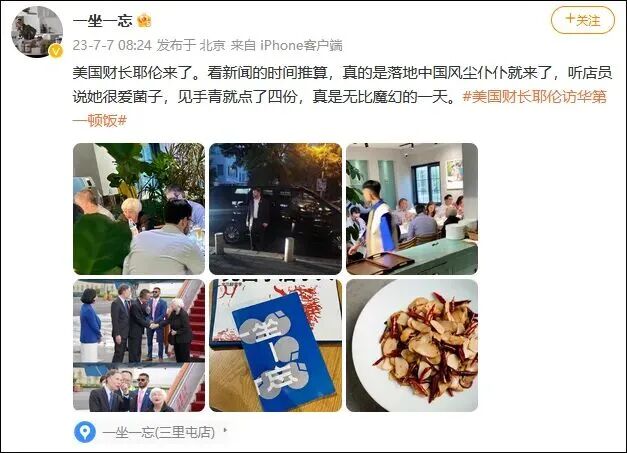 美国前财政部长耶伦抵京第一餐